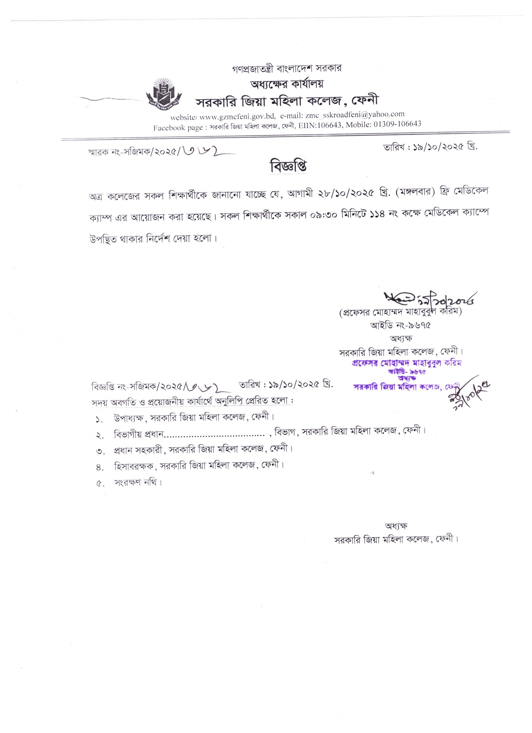 - শিক্ষার্থীদেরকে ফ্রি মেডিকেল ক্যাম্পে উপস্থিতির বিজ্ঞপ্তি।