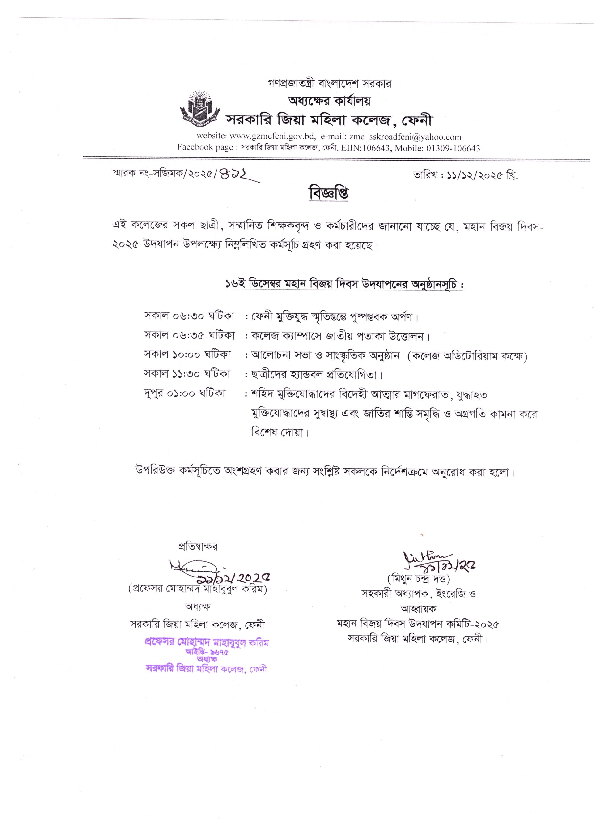 - ১৬ ডিসেম্বর মহান বিজয় দিবস-২০২৫ উদযাপন উপলক্ষ্যে অনুষ্ঠানসূচি।